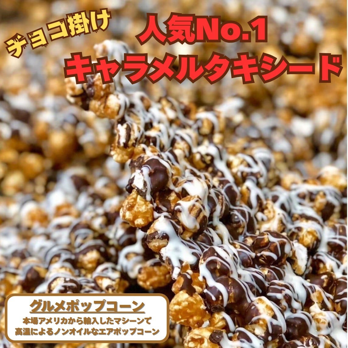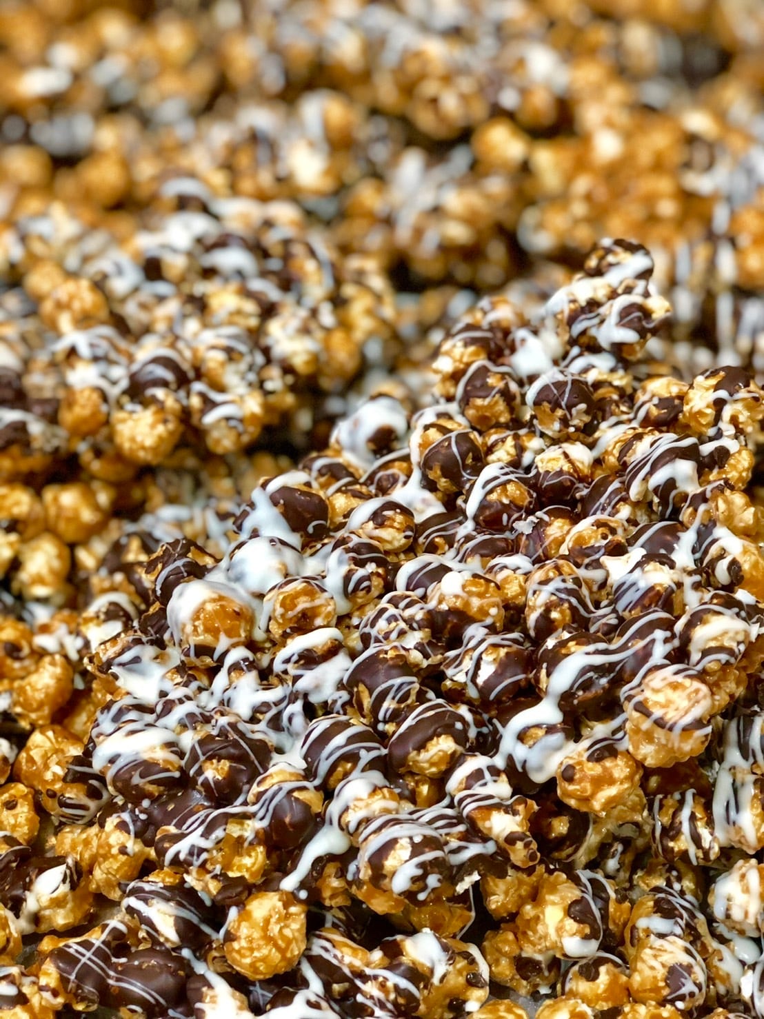 キャラメルポップコーンに、白と黒の高級チョコレートをたっぷりコーティング。