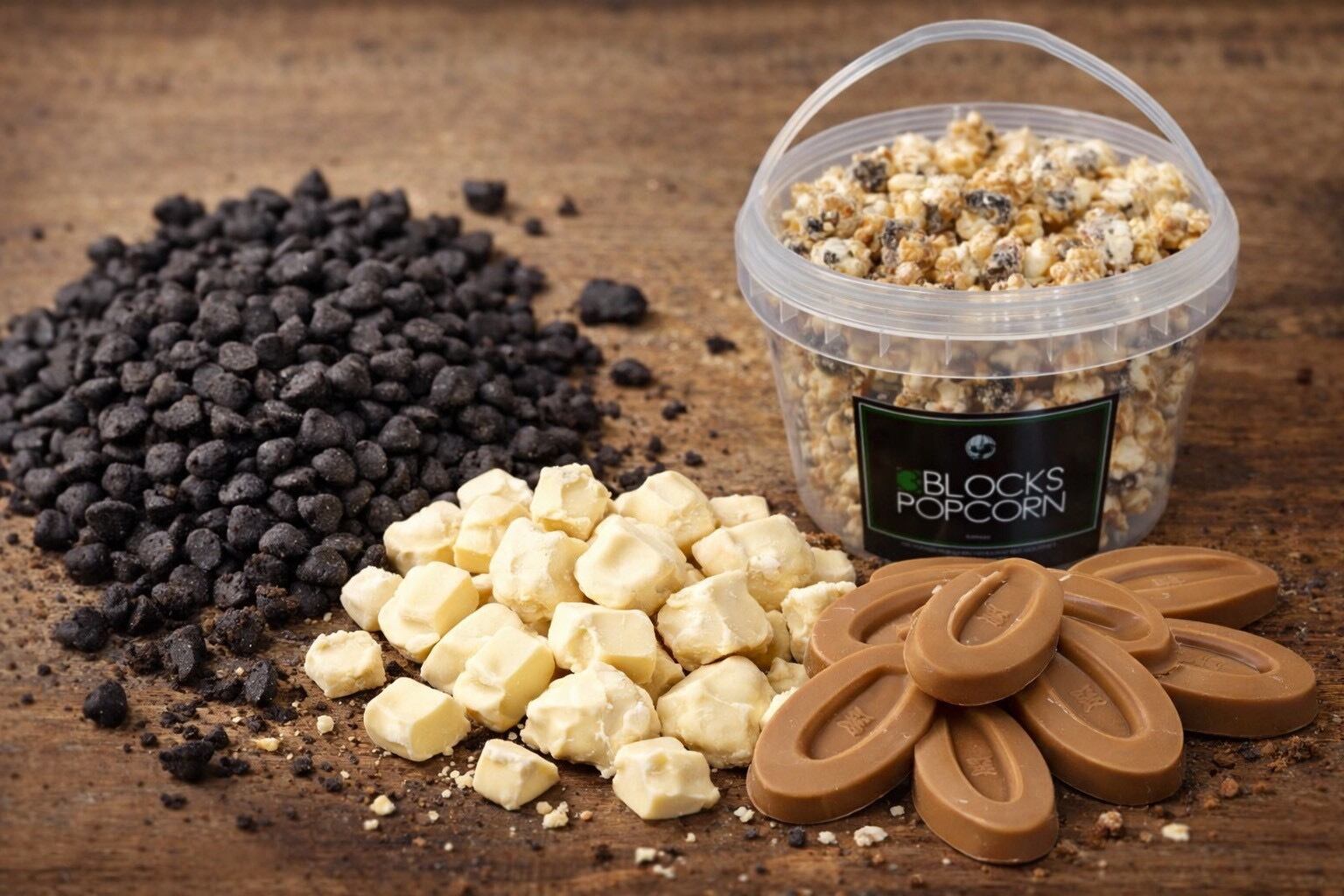 ヴァローナ社のブロンドチョコでコーティングしたポップコーンを更にホワイトチョコを掛けます。ブラックココアクッキーがアクセントにトッピングしてあります。冷蔵庫で冷やして食べると更に美味しい!